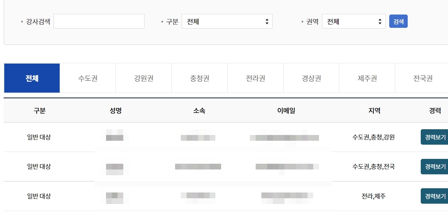 지역을 검색하시 아래와 같이 전문강사 명단이 나오며 경력을 보실 수 있습니다.