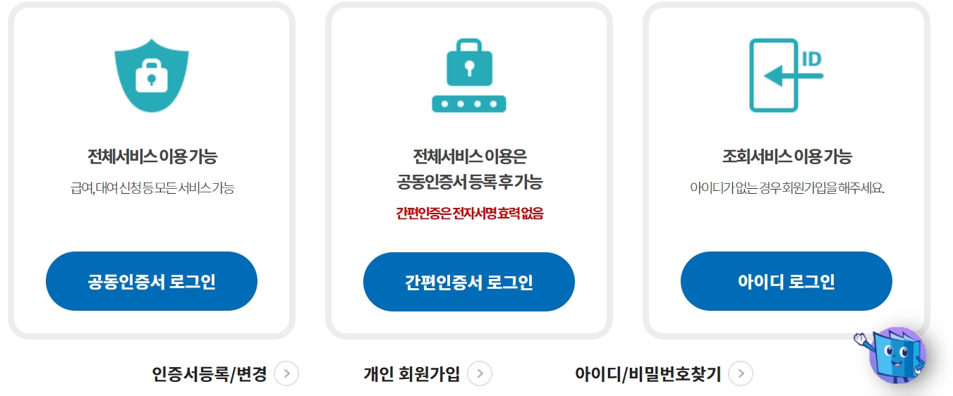 - 회원가입이후 로그인하실때는 공동인증서, 간편인증서, 아이디 로그인등 편하신 방법을 선택하셔서 로그인 하시면 됩니다. 아이디로그인은 조회서비스만 이용가능하며 모든 서비스를 이용하시려면 공동인증서 로그인을 진행해야 합니다. (기관일경우 공동인증서 로그인만 가능합니다)