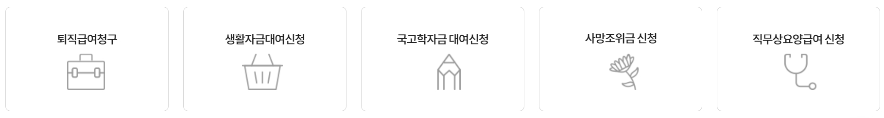 홈페이지에서 많이 찾는 서비스로 퇴직급여청구, 생활자금대여신청, 국고학자금 대여신청, 사망조위금 신청, 직무상요양급여 신청이 있습니다.