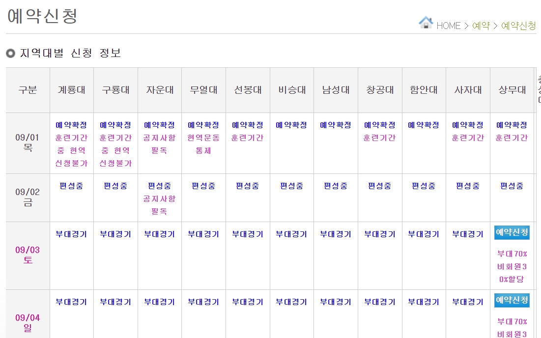 - 로그인후 지역대별 예약신청을 확인하시고 빈시간에 예약하시면 되는데요. 아래 표와 같이 확인됩니다.