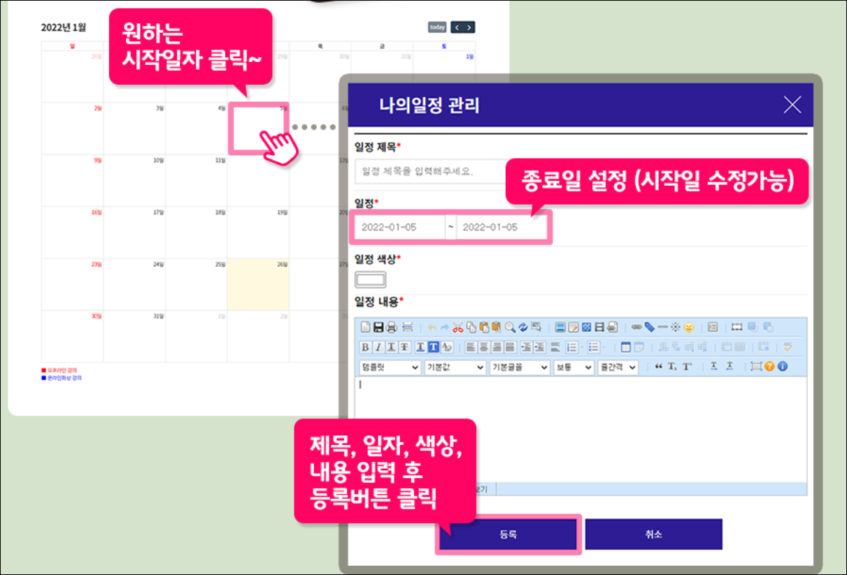 - 원하는 시작일자를 클릭하거나 종료일자를 설정하여 시작일 수정도 가능합니다.