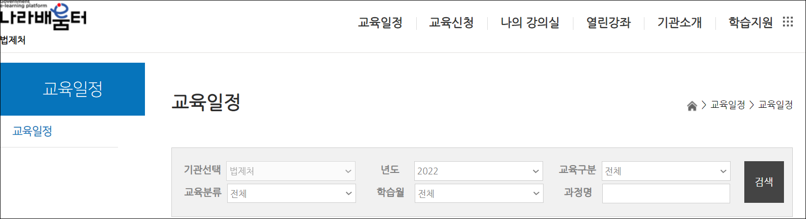 - 법제처 나라배움터 교육일정은 메인화면의 상단메뉴에서 선택하시면 됩니다. 교육일정 클릭시 아래와 같이 다양한 무료 교육이 올라와있습니다. 학습기간은 약 한달로 1000명정도 정원입니다.