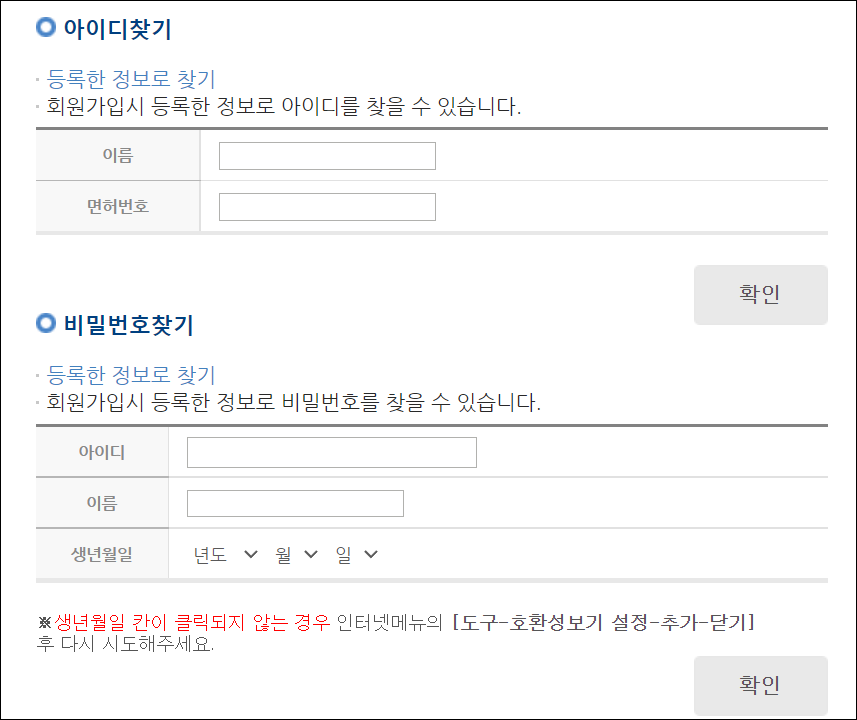 - 아이디/비번 분실시 회원가입시 등록한 정보 (이름/면허번호)를 통해 아이디 찾기가 가능합니다.