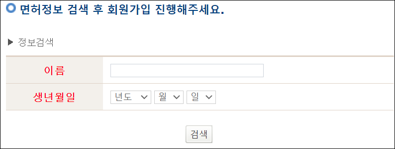 - 회원가입 진행시 면허정보 검색후 회원가입을 해야 합니다. 이름/생년월일을 입력후 검색버튼을 눌러주세요.