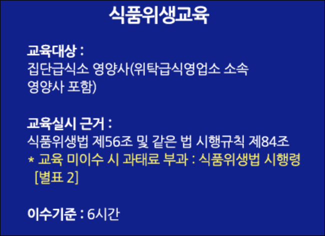 집단급식소에 근무하는 영양사 분들은 영양사 위생교육센터를 통해 1년에 6시간 영양사 식품위생교육을 의무적으로 수강하셔야 합니다. 위생교육 미수료시 식품위생법 위반으로 1차 20만원, 2차 40만원, 3차 60만원의 과태료가 부과됩니다.