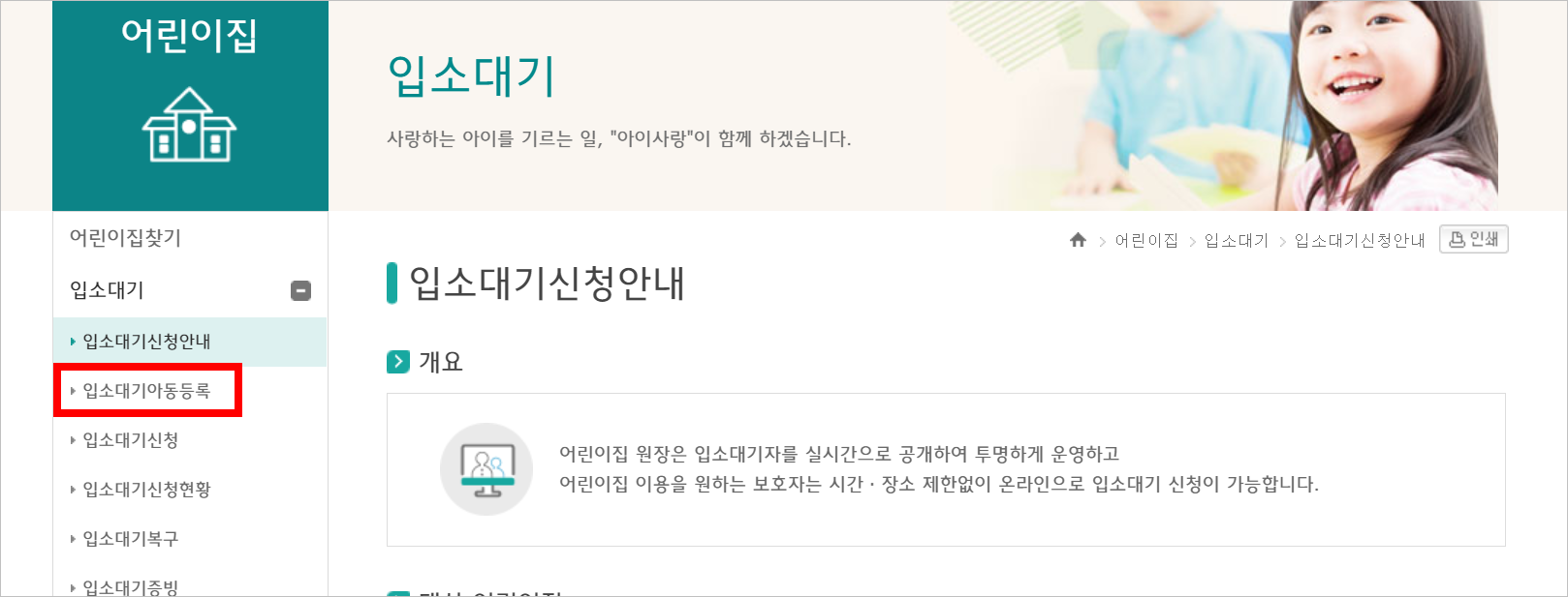 1. 메인화면 > 어린이집 > 입소대기 선택