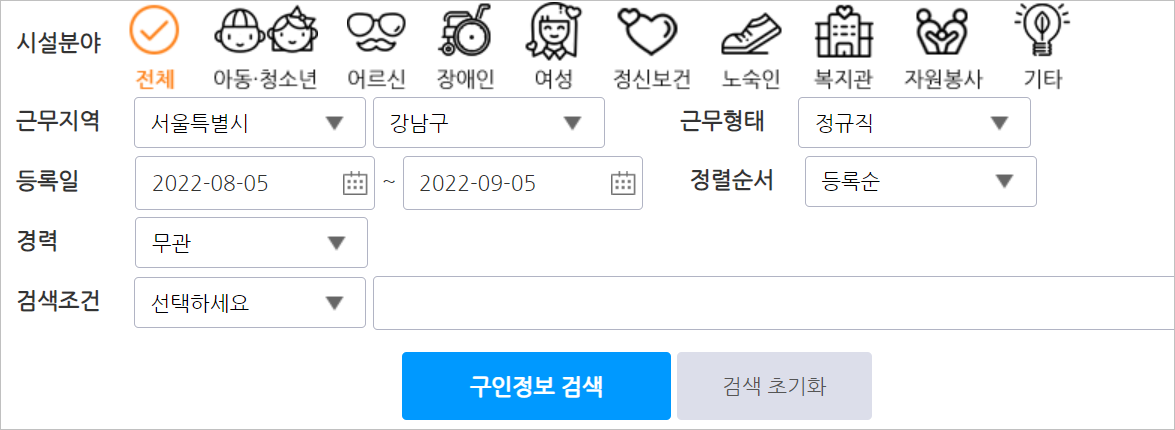 2. 구인정보에서 시설분야중 아동/청소년, 어르신, 장애인, 여성, 정신보건, 노숙인, 복지관, 자원봉사 중 원하는 분야를 선택합니다. 전체를 선택해도 됩니다. 또한 근무지역, 근무형태, 경력 등 세부사항 선택후 [구인정보 검색] 버튼을 눌러줍니다.