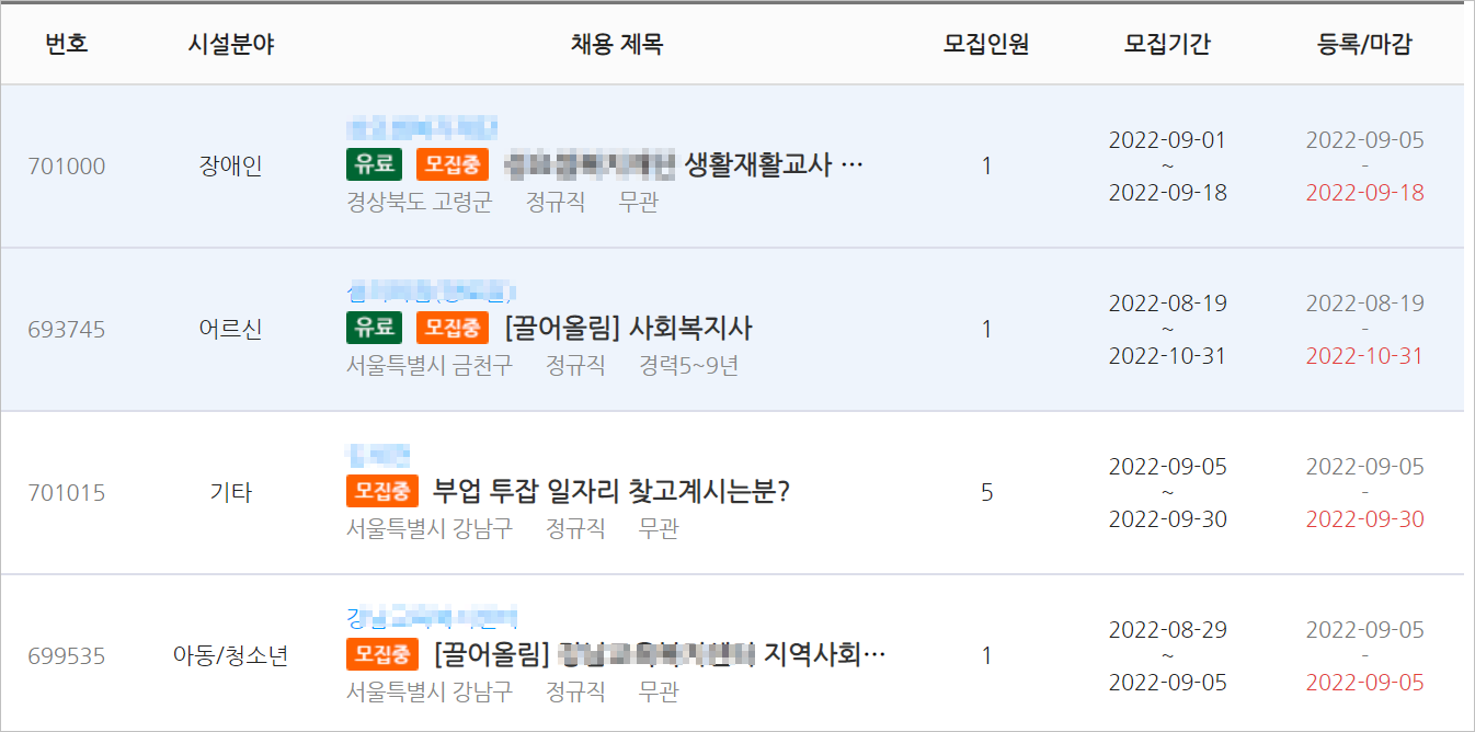 3. 검색결과 아래와 같이 어르신 사회복지사, 장애인 생활재활교사 구인정보가 확인되면 원하는 구인정보를 선택하여 세부내용을 확인합니다.
