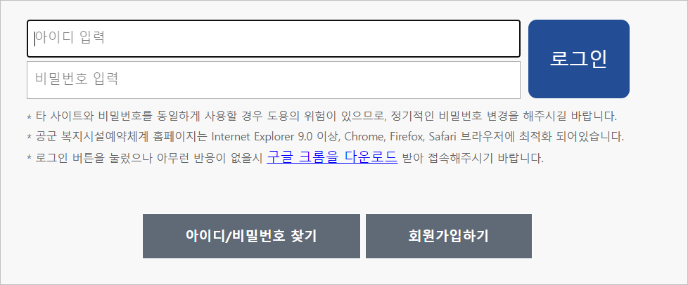 1. 공군체력단련장 홈페이지 접속 후 아이디 및 비밀번호 입력 후 로그인