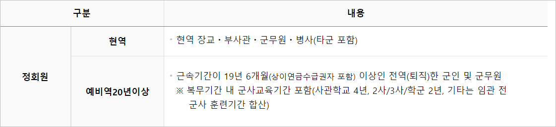 1. 정회원 : 현역 장교/부사관/군무원/병사, 예비역 20년이상