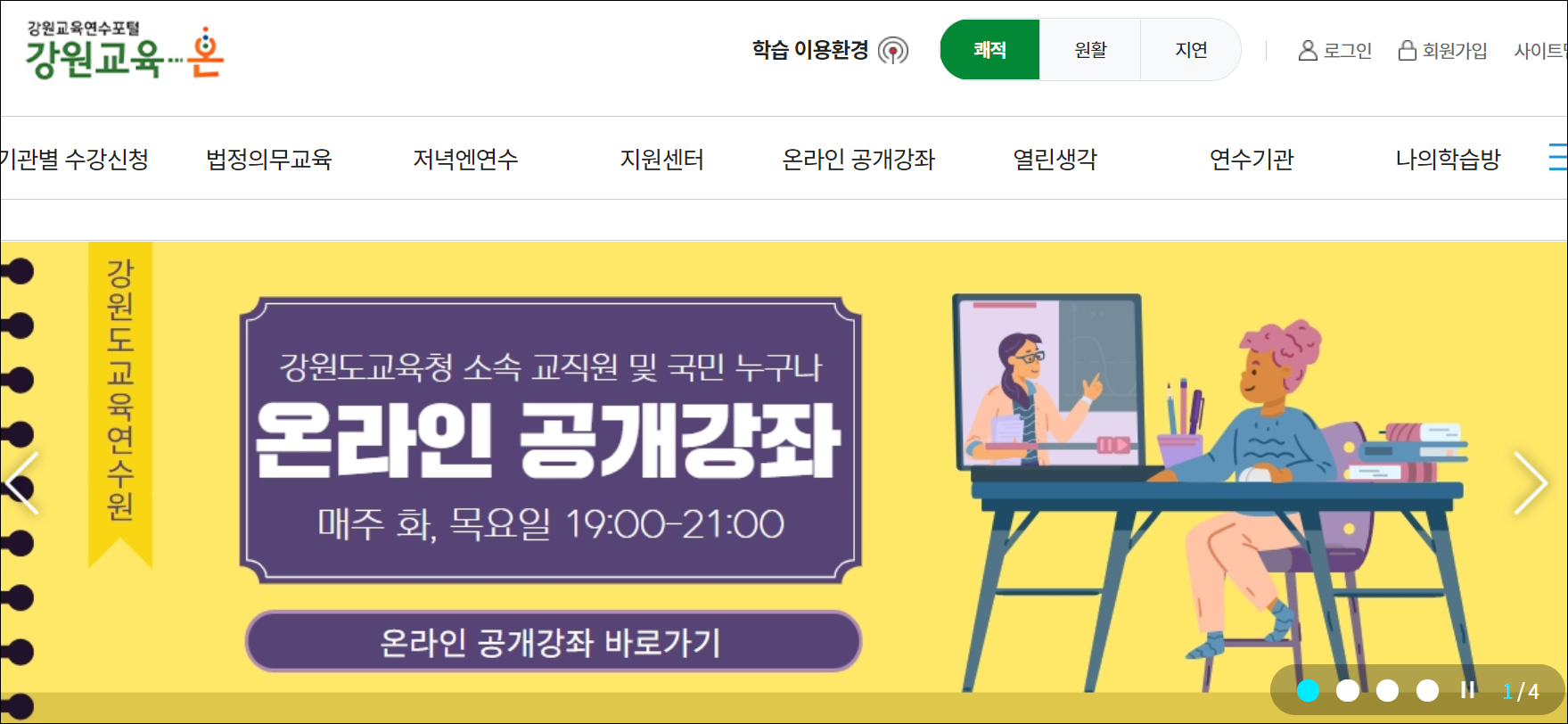 강원도 교육연수원 홈페이지는 "강원교육연수포털 강원교육 온" 사이트인데요. 교직원 및 교육공무원분들이 법정의무교육을 받을 수 있는 온라인공개강좌를 제공하고 있습니다. 해당 사이트 바로가기는 아래와 같습니다.