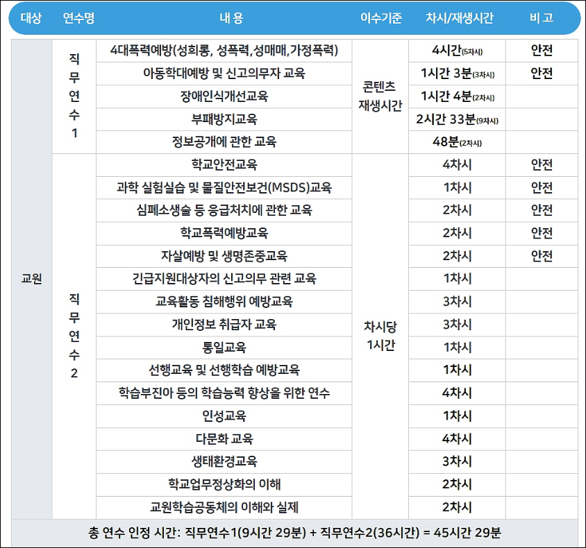 안전교육의 경우 교직원은 학교안전법에 근거하여 3년마다 15시간 이상 이수해야 하며 긴급지원대상자 신고의무 관련교육은 연 1회, 1시간이상 이수해야 합니다. 이밖에도 장애인식개선, 학교폭력예방교육, 아동학대예방 및 신고의무 교육등을 이수해야 합니다.
