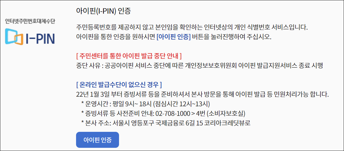 아이핀은 공공아이핀 서비스 중단에 따라 주민센터를 통해서 발급이 중단되었는데요. 온라인 발급수단이 없으신 경우 증빙서류를 지참하여 코리아크레딧뷰 본사를 방문시 아이핀 발급이 가능합니다.