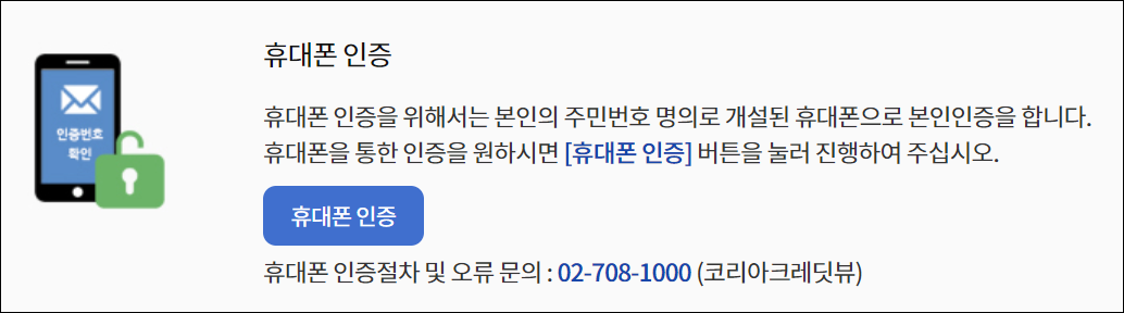 휴대폰은 본인의 주민등록번호로 개설된 휴대폰으로 본인인증을 진행하셔야 합니다.