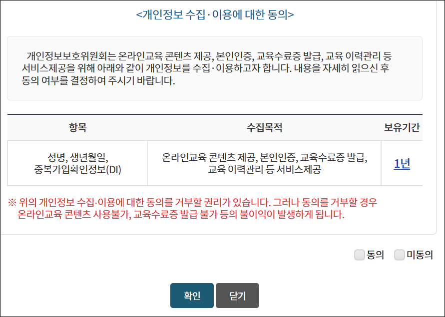 개인정보 수집 이용에 대한 동의를 클릭하시고, 확인버튼 클릭합니다.