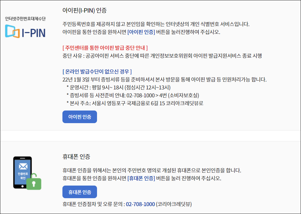 아이핀은 공공아이핀 서비스 중단에 따라 주민센터를 통해서 발급이 중단되었는데요. 온라인 발급수단이 없으신 경우 증빙서류를 지참하여 코리아크레딧뷰 본사를 방문시 아이핀 발급이 가능합니다.