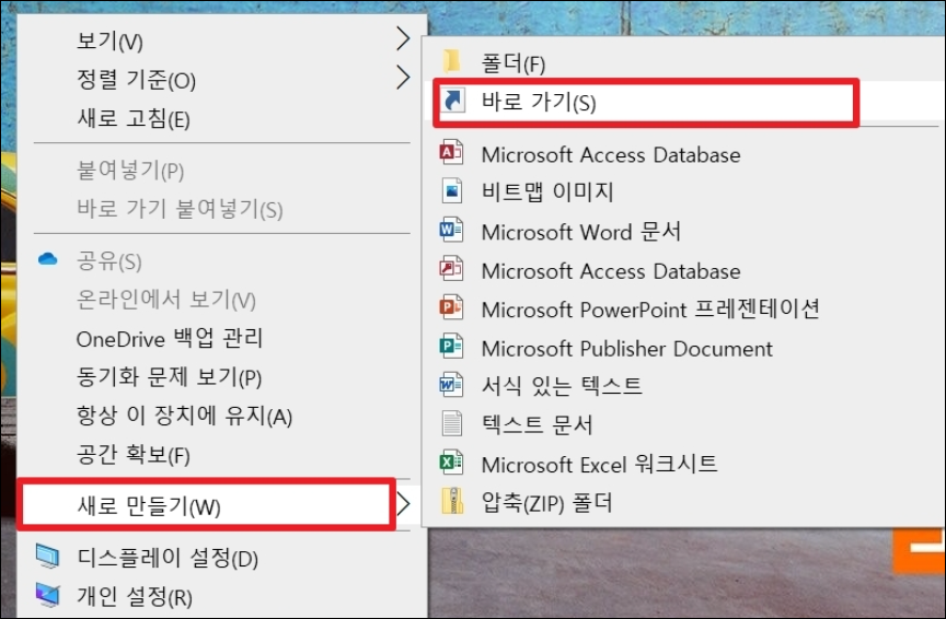 이번에는 바탕화면에 네이버 아이콘 만들기를 해볼건데요. 윈도우 바탕화면에 마우스를 대시고 오른쪽 버튼을 클릭해보세요. 그러면 아래처럼보이는데 여기서 새로만들기 옆의 바로가기를 선택해주세요.