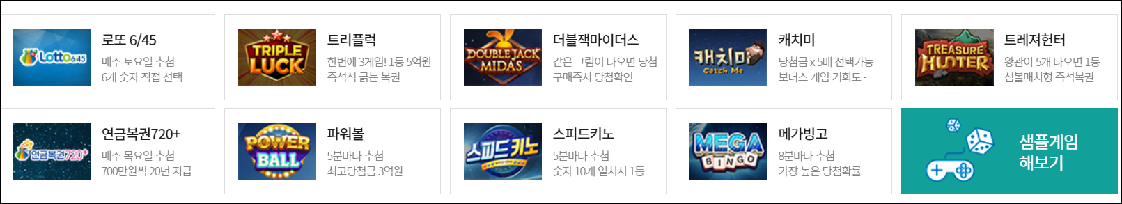 동행복권 사이트에서는 복권구매가 가능한데요. 로또 6/45, 트리플럭, 더블잭마이더스, 캐치미, 연금복권720+, 파워볼, 스피드키노, 메가빙고 같은 복권 구매가 가능합니다.