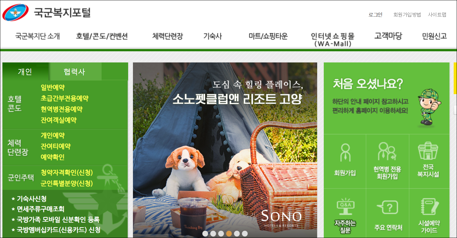 국군복지단은 국방가족들의 복지를 위해 체력단련장, 군마트, 호텔, 콘도 같은 복지시설을 운영하는 부대인데요. 국군복지단에서 운영하는 복지사이트가 국군복지포털입니다.