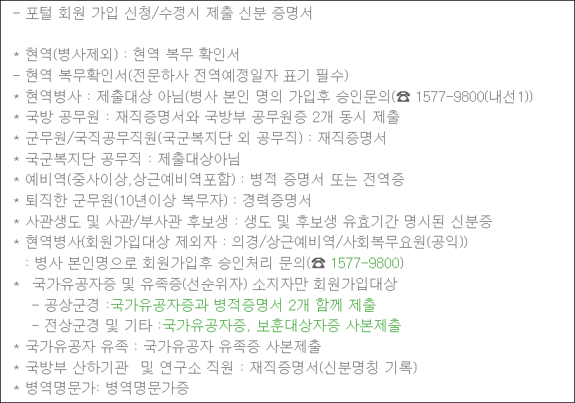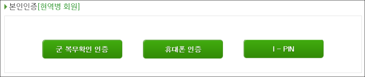 4. 현역병 회원은 군복무확인 인증 혹은 휴대폰 인증 혹은 I-PIN 인증을 통한 본인인증 절차를 거쳐야 합니다.