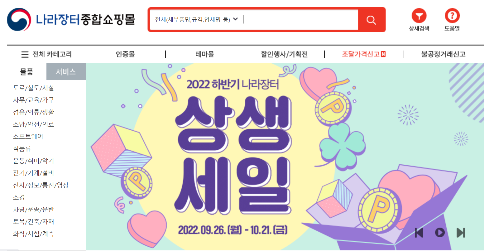 쉽게 말하자면, 공공기관인 정부, 학교, 지자체 등에서 사용하는 물품과 서비스를 온라인 사이트에서 손쉽게 구매할 수 있도록 운영중인 쇼핑몰입니다.