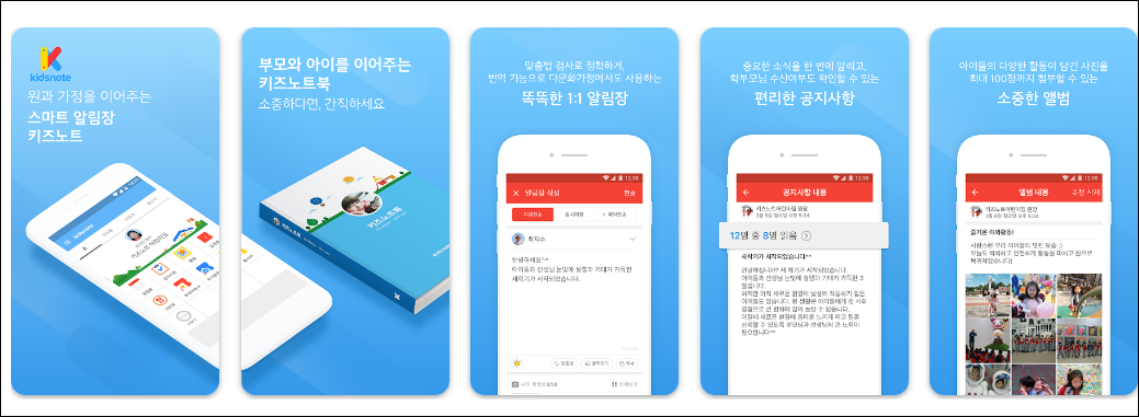 스마트 알림장 키즈노트는 어린이집, 유치원, 학원, 학교, 펫 유치원등의 기관이 가정과 커뮤니케이션을 하기 위한 서비스인데요. 종이알림장 대신 메신저로 부모님과 연락할 수 있습니다.