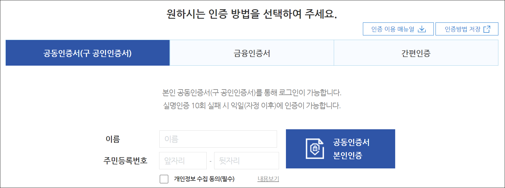 2. 공동인증서, 금융인증서, 간편인증 중에 택하여 본인인증 진행후 로그인하기
