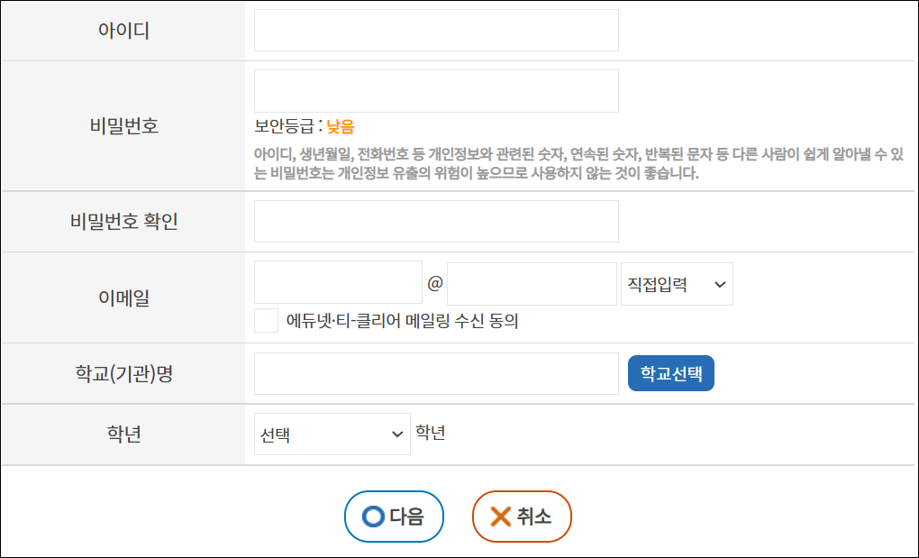 8. 아이디, 비밀번호, 이메일, 학교명, 학년 선택후 다음버튼을 클릭하여 회원가입을 완료합니다.