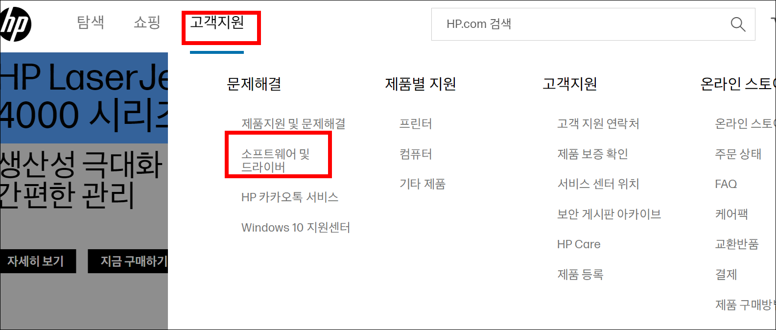 2. 메인화면의 고객지원 > 문제해결 > 소프트웨어 및 드라이버 선택하기