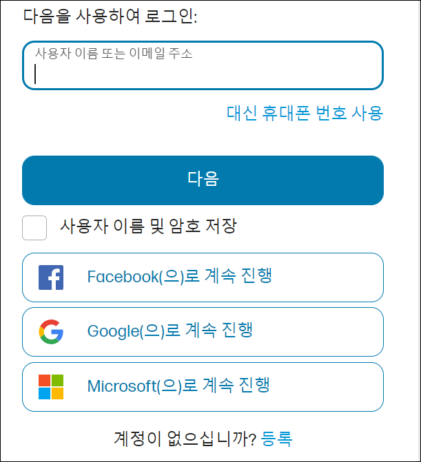 8. 핸드폰 번호 혹은 이메일 주소를 이용해 로그인할 수 있습니다. 계정이 없다면 [등록]버튼을 클릭해 새로운 계정을 만들어야 합니다.