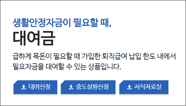 -급하게 목돈이 필요한 경우 가입한 퇴직급여 내에서 필요자금을 대여할 수 있는 서비스인데요. 대여가능금액은 퇴직급여 탈퇴시 수령액 범위내에서 가능하며 대여 이율은 연 3.85%입니다.
