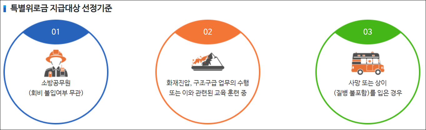 특별위로금이란 화재진압이나 구조업무수행, 교육훈련중 순직하거나 상해를 입은 소방공무원분들에게 지급되는 위로금인데요. 회비 불입여부와 무관하게 지급되며 금액등 자세한 내용은 아래 링크를 통해 확인하세요.