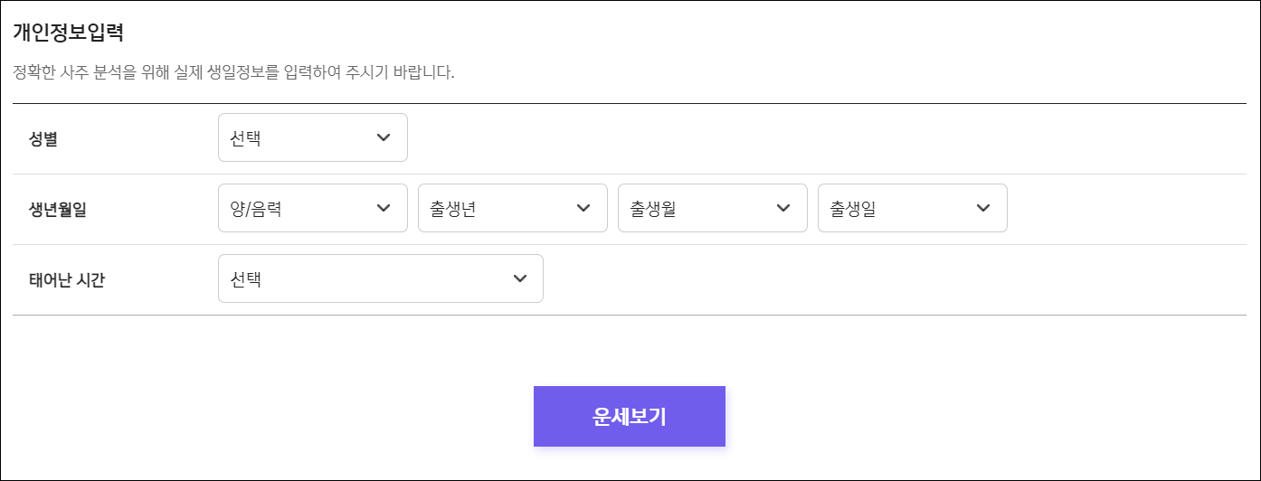 이용방법은 위에 제공해드린 링크를 통해 홈페이지 접속 후 개인정보를 입력하셔야 하는데요. 성별/생년월일/태어난시간 입력후 [운세보기]클릭시 바로 이용가능합니다.