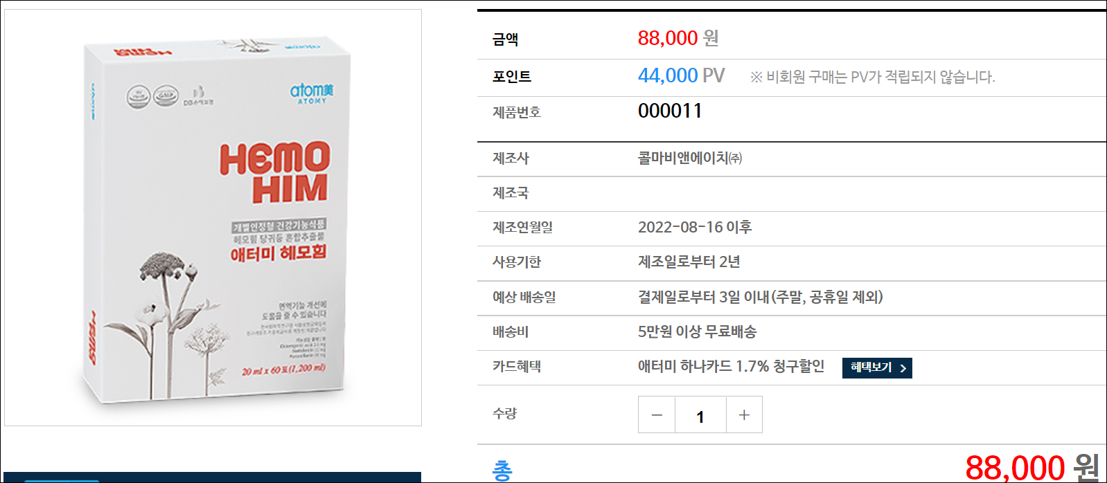 -또한 비회원주문도 가능하지만 비회원은 포인트 적립이 안되므로 대부분 회원가입 후 쇼핑몰을 이용하는편입니다. 예로 헤모힘 60포의 경우 구매가는 88,000원이지만 회원은 44,000점이 적립되고, 비회원은 포인트가 적립되지 않습니다.