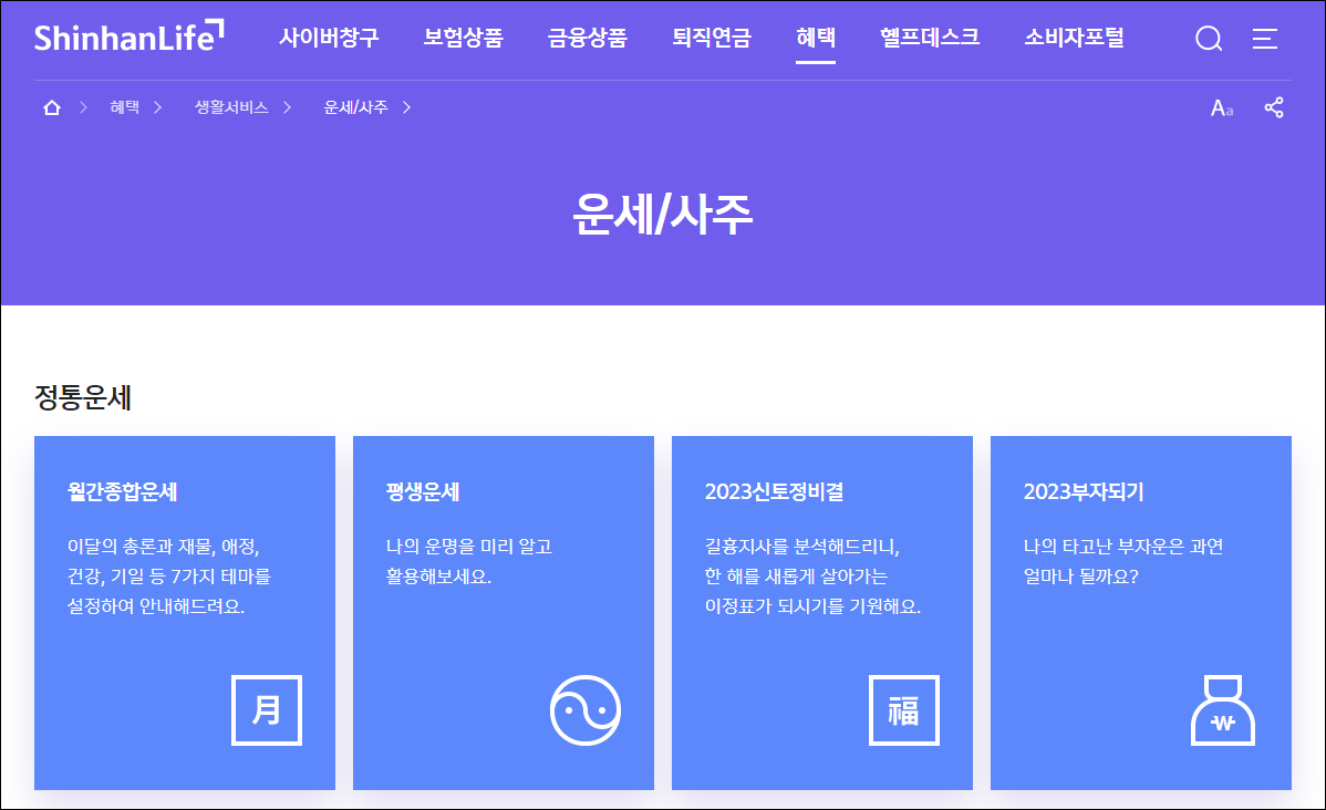 오늘 알아볼 내용은 신한생명 무료운세 바로가기인데요. 신한생명은 홈페이지에서 [운세/사주] 메뉴를 통해 무료운세를 제공하고 있습니다.