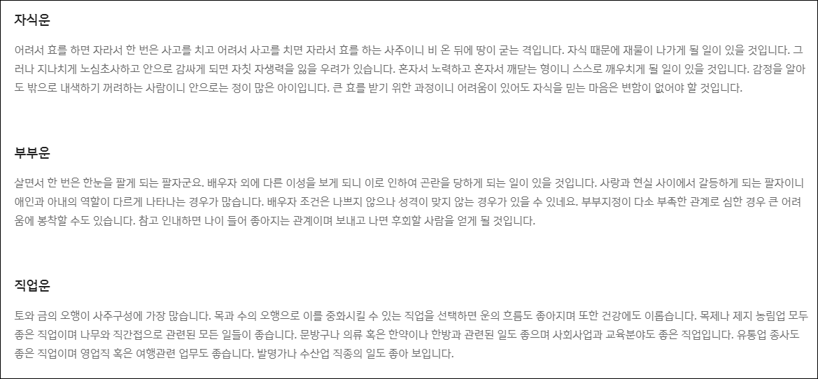 - 나의 운명을 미리 알아보고 활용가능합니다. 평생의 운세를 미리 알아보고, 타고난 나의 운명을 활용할 수 있도록 초년/중년/말년, 형제, 자식, 부부, 직업 테마 6가지로 구성되어 있습니다.