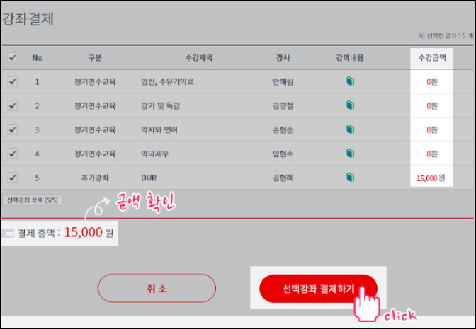 4. 정기연수교육 외 추가 강좌 선택시 추가강의비를 납부해야 합니다.