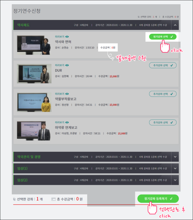 1. 신상 신고 회원은 한 카테고리에서 정기연수로 선택한 강좌만 무료입니다.