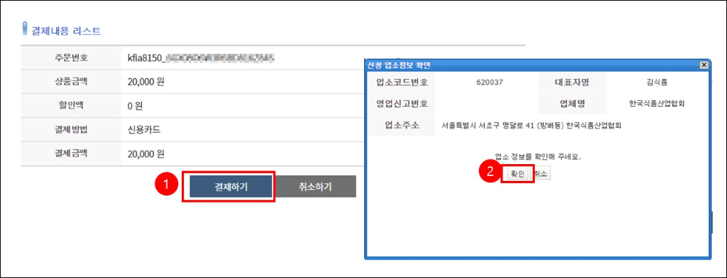 - 업소코드를 모를경우 업소 코드번호 검색] 클릭후 대표자, 주소검색하여 코드번호 확인 후 을 클릭 후 대표자, 주소 검색하여 업소코드번호 확인 및 [교육신청] 버튼을 클릭합니다.