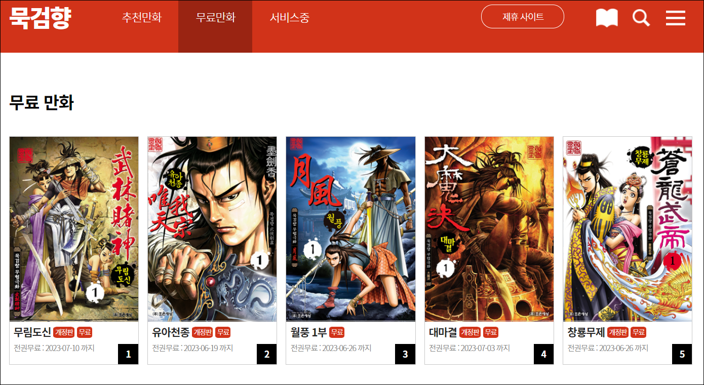 묵검향 사이트에는 유료작 외에도 무림도신, 유아천종, 월풍, 대마결 등 무료 무협만화를 볼 수 있는데요. 해당 사이트 바로가기는 아래와 같습니다.