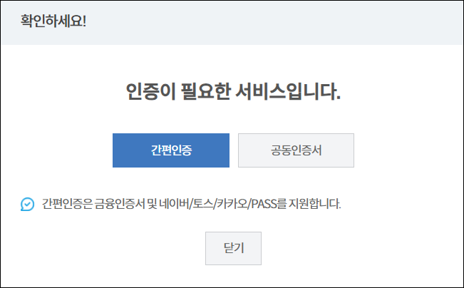 10. 간편인증 혹은 공동인증서 인증을 선택하여 인증을 완료하면 인터넷 발급이 완료됩니다.