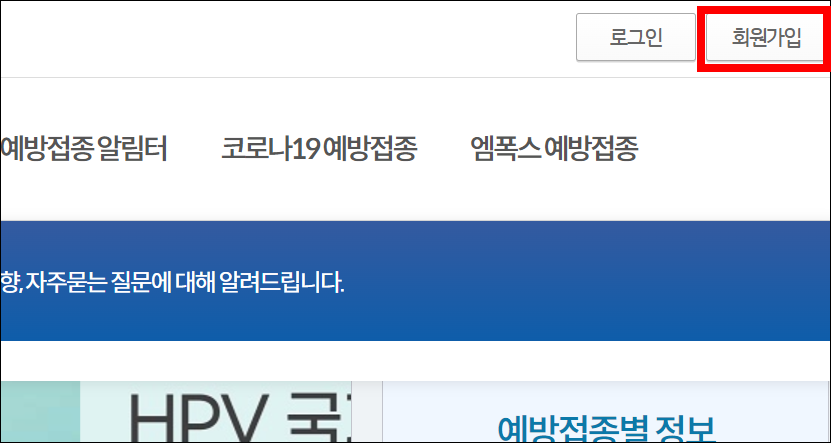 2. 홈페이지 메인화면의 우측상단에 있는 [회원가입]버튼을 클릭하세요.