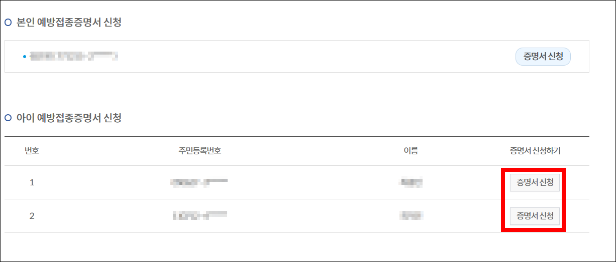 8. 예방접종증명서가 필요한 본인 혹은 자녀에 대해 증명서신청을 선택하세요. (아직 아이가 등록되지 않았다면 먼저 아이를 등록해야 합니다)