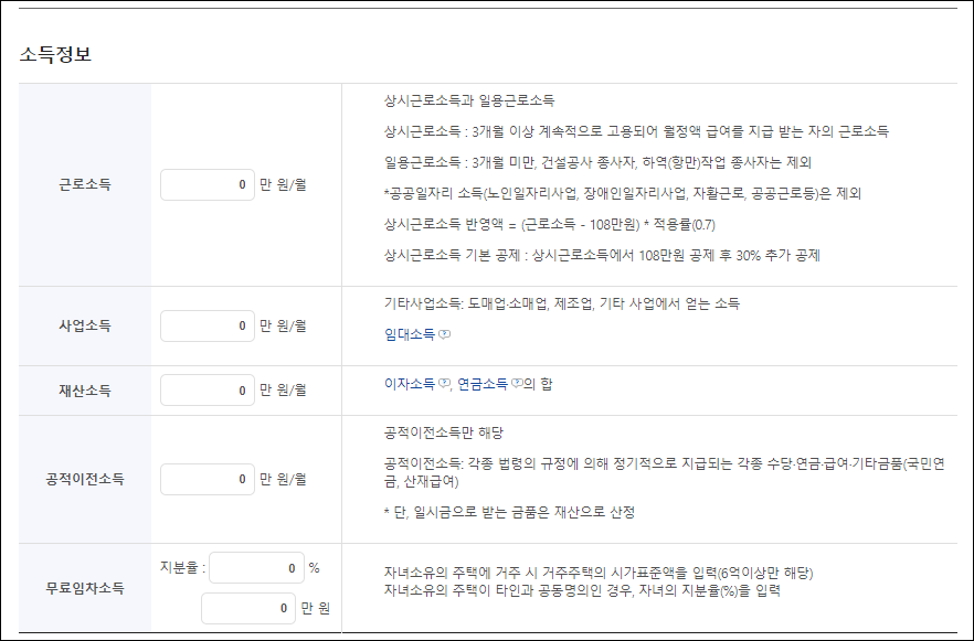 2. 다음으로 소득정보를 입력해야 하는데요. 근로소득은 상시근로소득과 일용직, 알바소득등을 모두 합하여 한달에 버는 소득을 입력해야 합니다. 사업소득은 사업소득과 임대소득을 모두 합한 금액입니다. 재산소득은 연금소득과 이자소득 모두 포함해야 합니다.