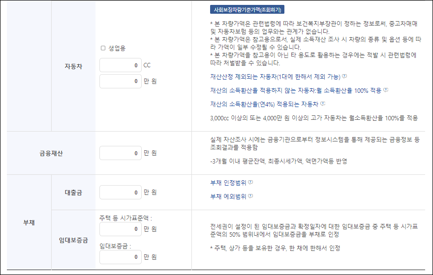 2. 다음으로 소득정보를 입력해야 하는데요. 근로소득은 상시근로소득과 일용직, 알바소득등을 모두 합하여 한달에 버는 소득을 입력해야 합니다. 사업소득은 사업소득과 임대소득을 모두 합한 금액입니다. 재산소득은 연금소득과 이자소득 모두 포함해야 합니다.