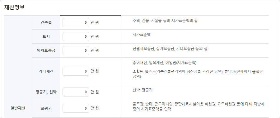 3. 다음으로 재산정보를 입력해야 하는데요. 건축물, 토지, 임차보증금, 기타재산, 항공기, 선박, 회원권, 자동차등의 일반재산과 금융재산을 모두 기입하시면 됩니다. 또한 부채 현황도 입력하시면 됩니다.