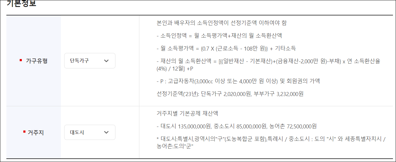 1. 먼저 기본정보 입력인데요. 아래와 같이 가구유형과 거주지를 선택하세요. 가구유형은 단독인지 부부가구인지 선택하시고, 거주지는 대도시인지 중소도시인지 농어촌인지 선택하시면 됩니다. 가구유형과 거주지에 따라 기준액이 달라집니다.