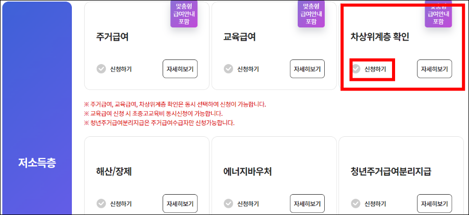 3. 신청가능한 여러가지 복지혜택이 보이는데요. 저소득층 복지의 차상위계층확인의 신청하기를 클릭하시고 하단의 [저장후 다음단계] 버튼을 클릭하세요.