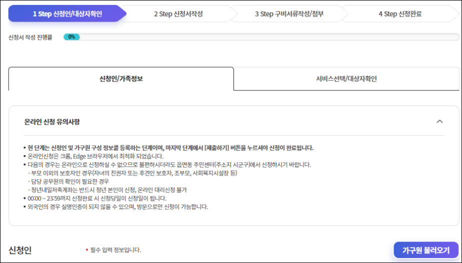 8. 다음화면에서 신청인과 가족정보를 자동으로 불러올 수 있도록 [가구원 불러오기]버튼을 클릭하세요. 그러면 자동으로 가족정보가 나타나는데요. 신청서를 차근차근 작성하신 후 구비서류를 첨부하시면 신청이 완료됩니다.