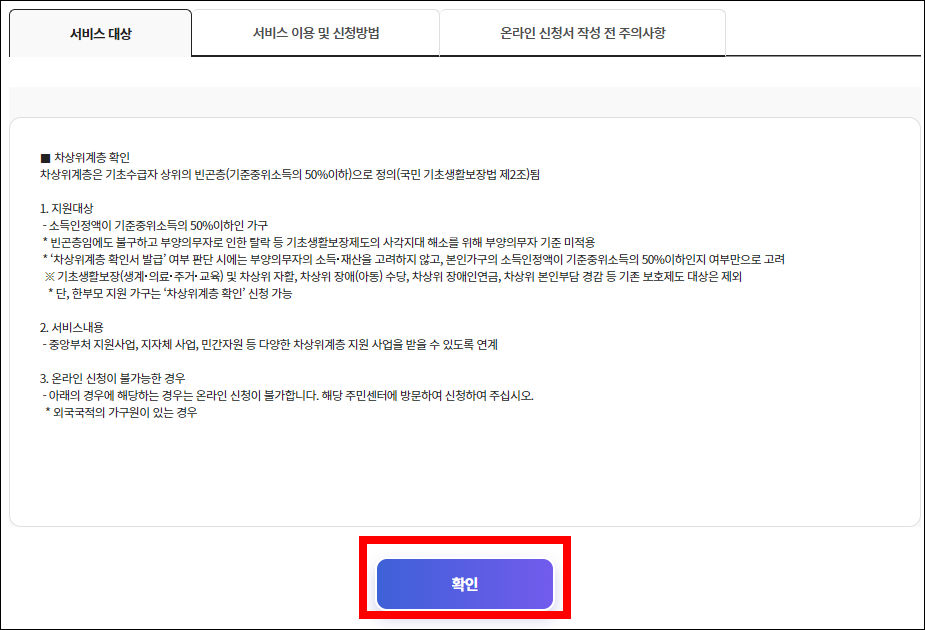 7. 서비스 대상은 소득인정액이 기준중위소득 50%이하인가구인데요. 외국국적의 가구원이 있는 경우를 제외하고 누구든 온라인 신청이 가능합니다. [확인]버튼 클릭하세요